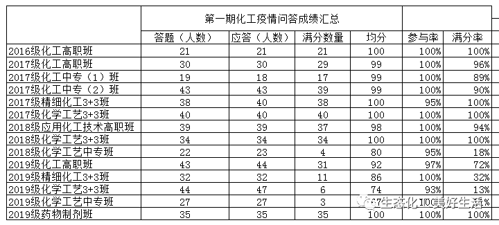 本次疫情知識問答活動面向全系學生,涉及到疫情防控知識、化工專業(yè)知識、專業(yè)認知學習等內(nèi)容,通過微信公眾號平臺在線答題的方式,采取單選題、多選題的形式,旨在引導學生關(guān)心、掌握防疫知識,增強對化工學科的認知,讓學生把科學防控、專業(yè)知識的內(nèi)容內(nèi)化于心、外化于行。本階段的疫情問答,營造了防控疫情的良好氛圍,學生參與度也較高。參與率為100%的班級共10個,90%及以上的班級共4個;滿分率100%的共有5個班級,90%及以上的共3個班級。