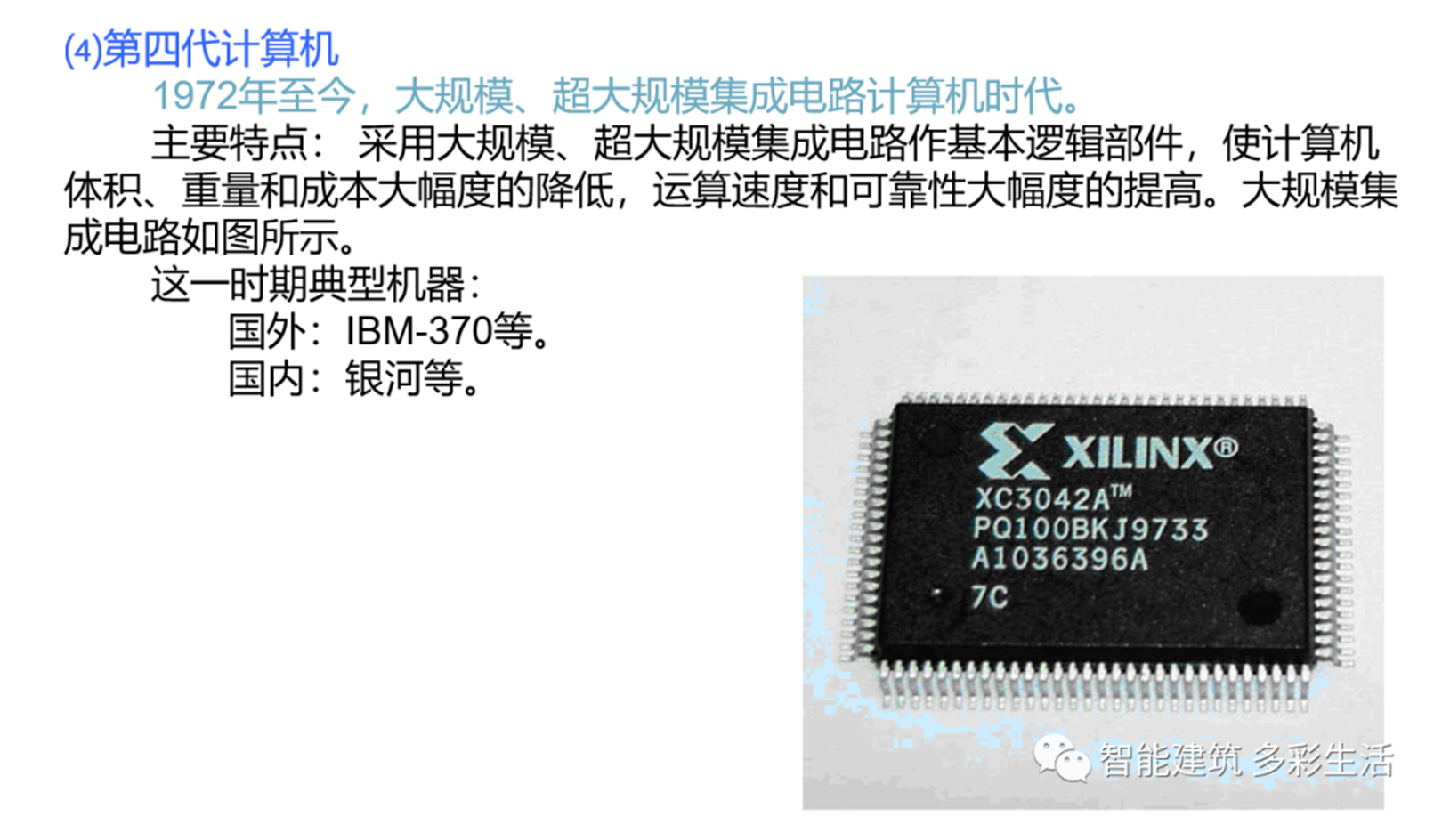 第四代計算機(1971~ )以大規(guī)模集成電路為主要器件;運算速度每秒幾百萬次至上億次。