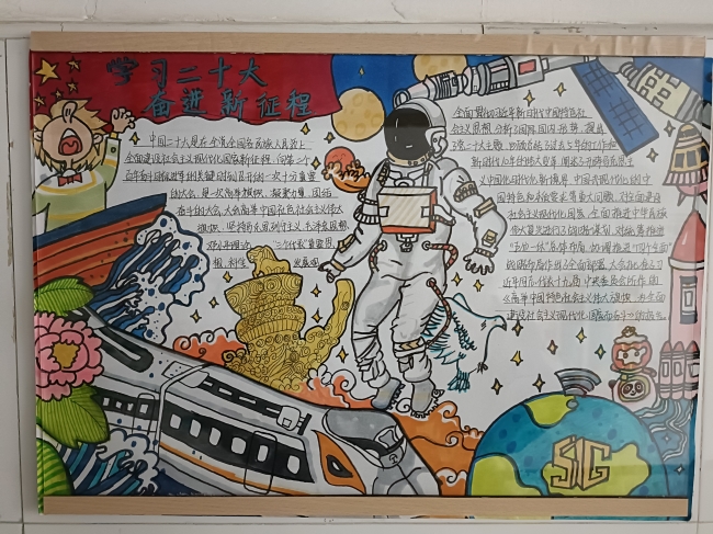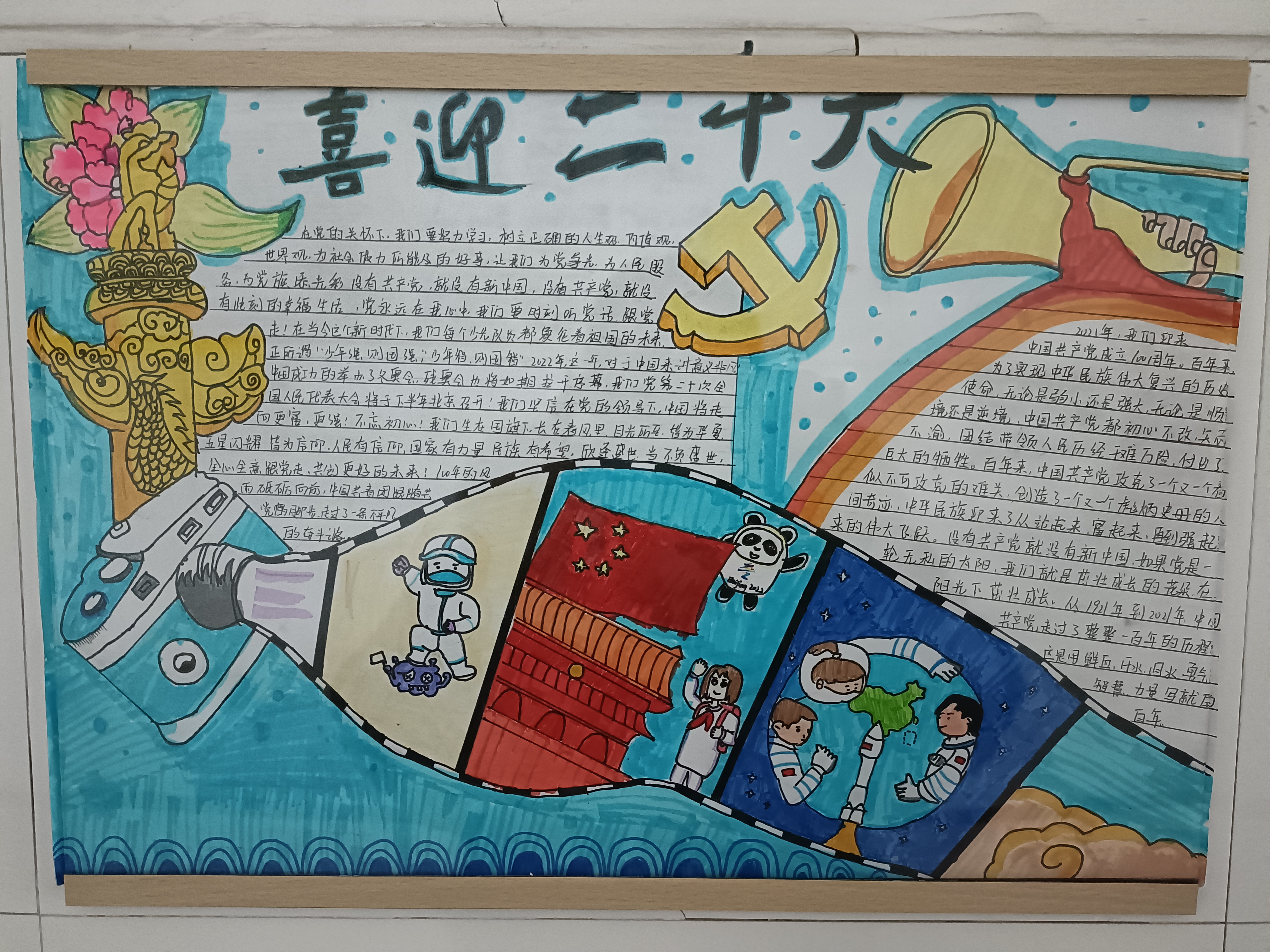 自收到活動通知起,同學(xué)們就開始了素材的收集、篩選和手抄報的整體布局工作。在創(chuàng)作過程中,同學(xué)們思維活躍,通過巧妙設(shè)計構(gòu)思、精心安排布局,將各類精致元素恰如其分地融合匯聚,以手繪的形式將黨的二十大精神體現(xiàn)在一幅幅精美的手抄報中,表達對黨的禮贊、對祖國的熱愛,展現(xiàn)出同學(xué)們"學(xué)習(xí)二十大,青春心向黨"的信心和決心,體現(xiàn)了當(dāng)代青少年與新時代同心同德、砥礪奮進的美好愿景。